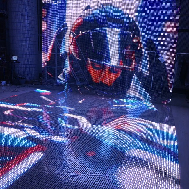 Product Features: The P20LMP model features 8-bit color resolution, 3840Hz refresh rate, and 2000 nits brightness. Ideal for building facade lighting, nightclub ceiling decoration, shop front elevation display, video walls, and party/event curtain lighting. Flexible mesh design supports various shapes including curves and arches, with 70% high transparency and IP65 protection rating.